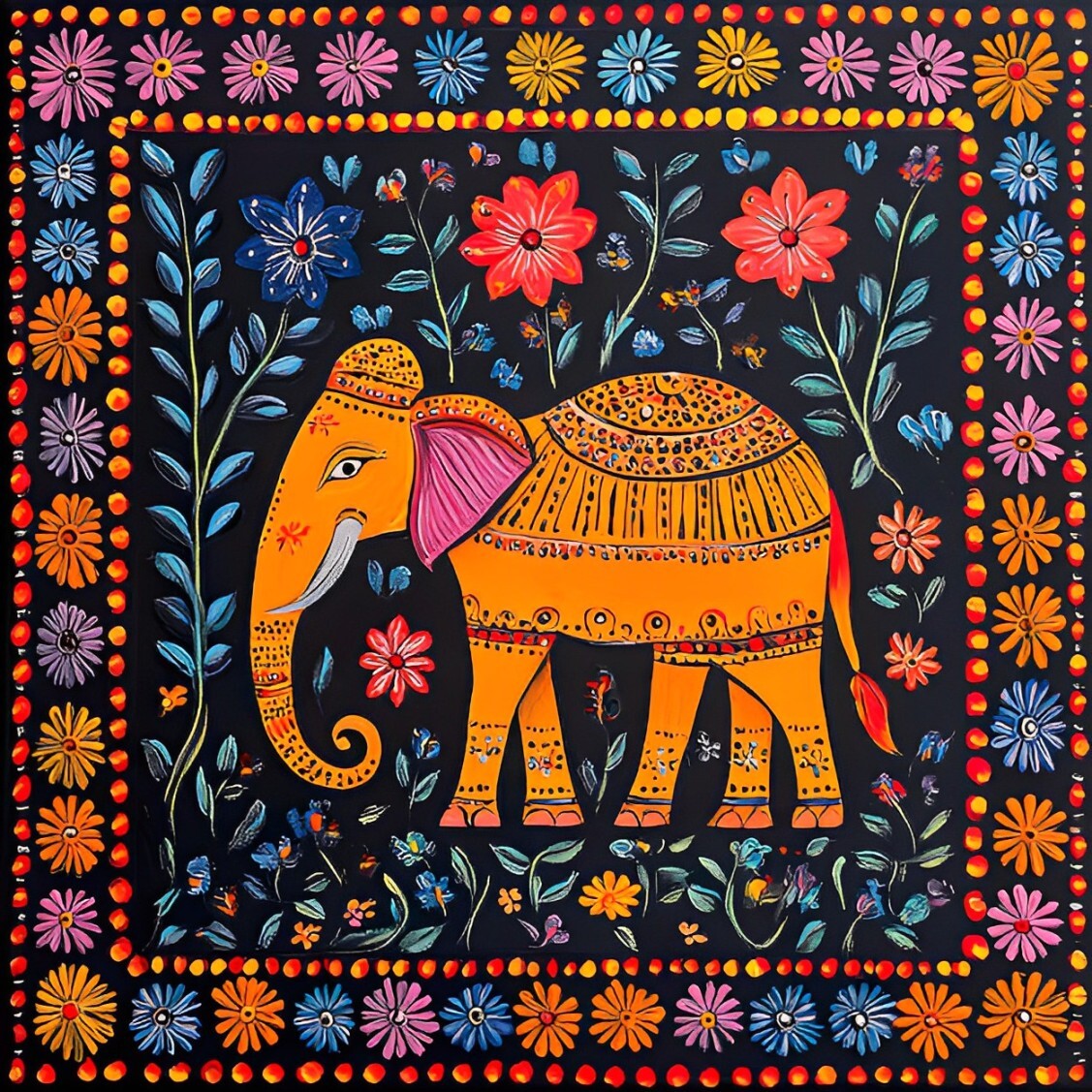 Madhubani paintings are rich with symbolism, where every shape, creature, and color holds meaning: